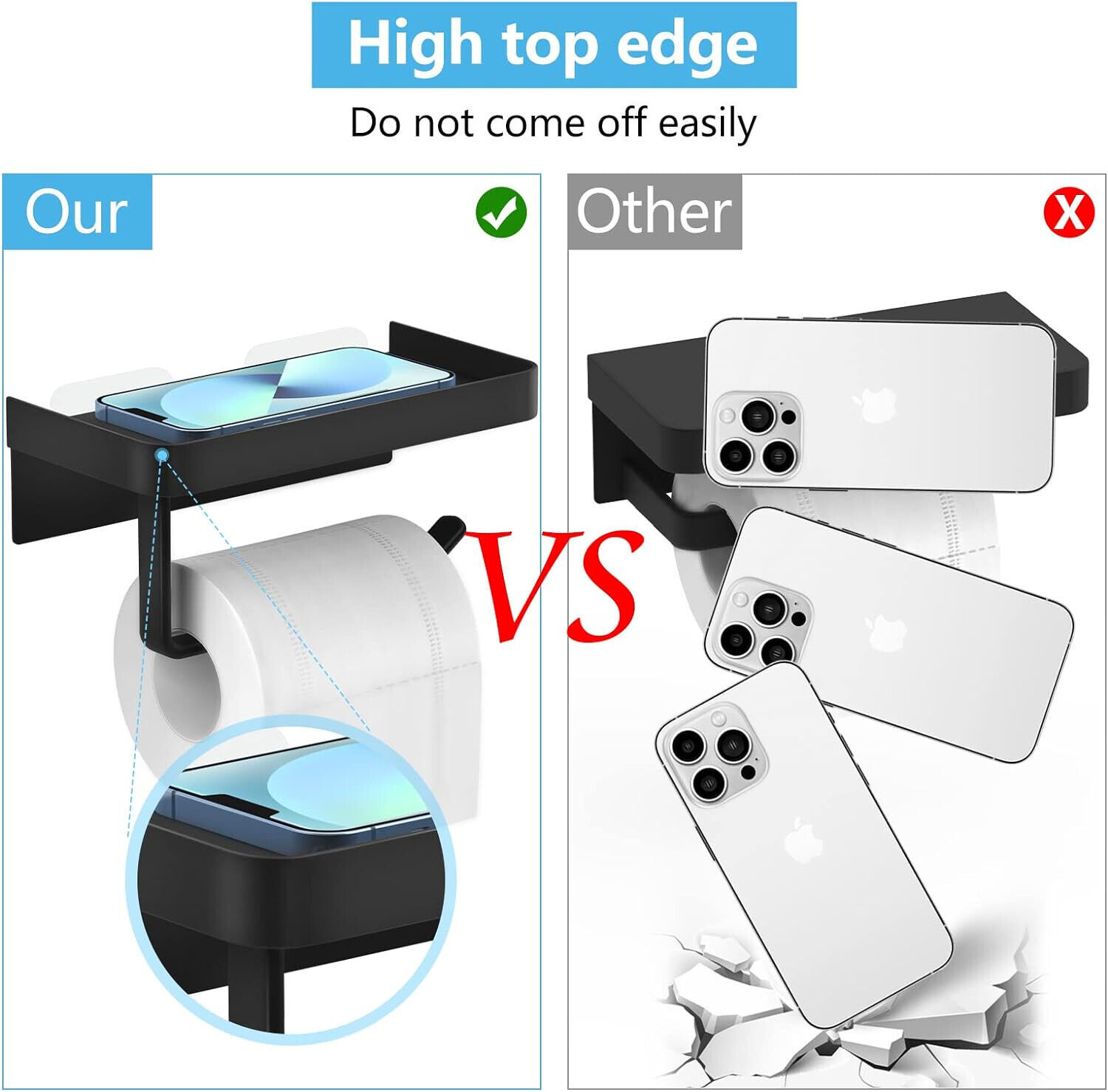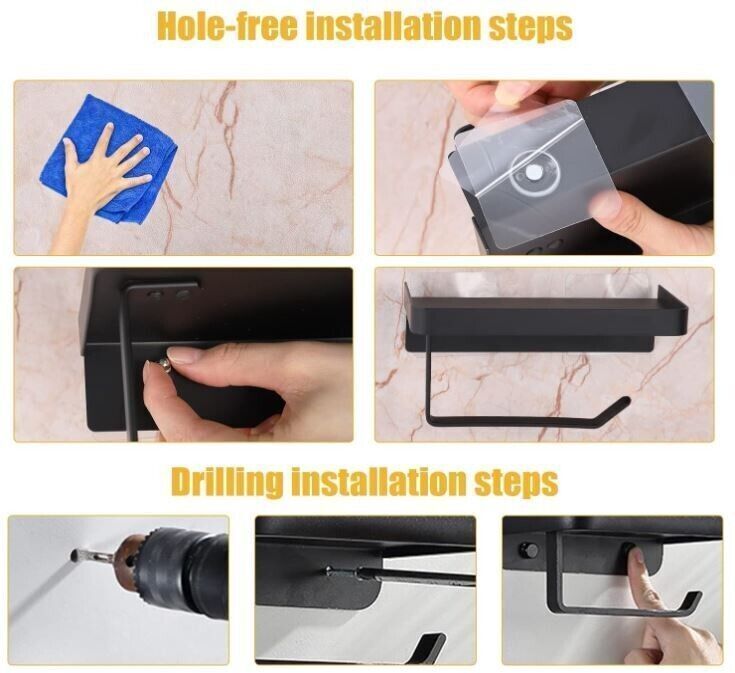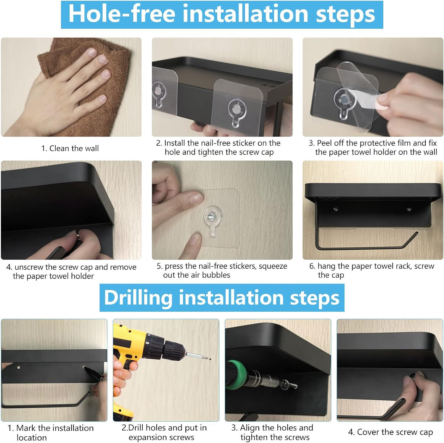 - The toilet paper holder offers 2 mounting options: self-adhesive or screw mount. The self-adhesive toilet paper holder adopts self-adhesive installation, no drilling is required, it will not damage the wall.