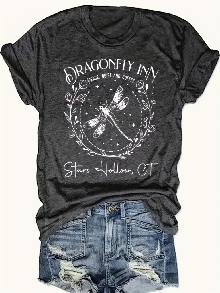 Dragonfly Minimalist Letter Pattern Printed Plus Size T-shirt, Casual Round Neck Summer Short Sleeved Women’s Top